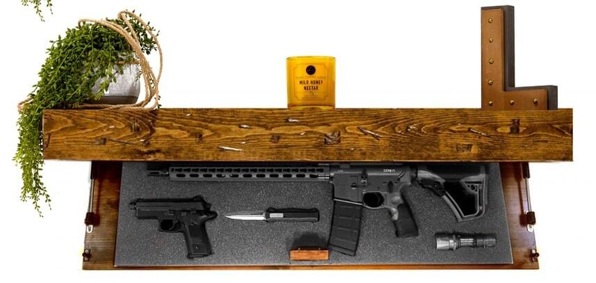 The Defender 45R somehow manages to blend high-end luxury with the rugged outdoors in a way we've never seen before! If you have an AR-15, shotgun, AK-47 or any other gun with a long barrel rifle… this is definitely something you need to add to your collection. It measures 45" long and 12.5" deep, and can be used as mantle in your living room, bedroom, underneath a TV or anywhere where else you want. You can not only fit your rifle or shotgun in it but several handguns as well. In the pictures below I have Daniel Defense V-11 Tornado, Glock 22, Benchmade Infidel knife, two full magazines and Surefire flashlight with plenty of room to spare.